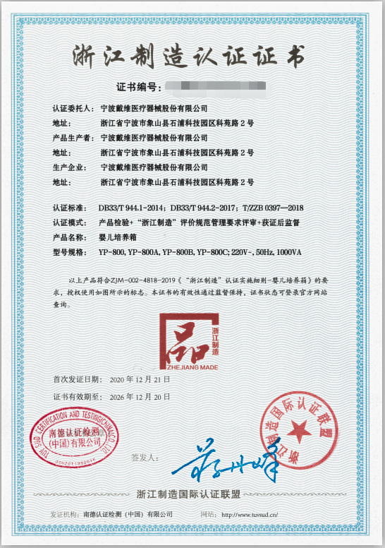 12月21日,寧波戴維醫(yī)療器械股份有限公司的YP-800系列嬰兒培養(yǎng)箱已通過浙江制造認證,獲得了“品字標浙江制造”證書。